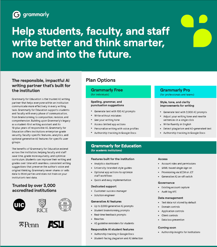 Grammarly For Education (Grammarly@EDU) licence je výhodný balík rozšířených licencí Grammarly Premium pro vzdělávací instituce. V současnosti software používá ve světě přes 3000 vzdělávacích institucí a milióny studentů. Používání této aplikace zlepšuje psací dovednosti a autokorekturu, rozšiřuje slovní zásobu, pomáhá s nastavením míry formálnosti textu, verifikuje text vůči plagiátorství prostřednictvím 16 miliard webových stránek. Snadno se integruje s řadou LMS nástrojů. V rámci @EDU licence je k dispozici rozsáhlá databáze pro kontrolu plagiátorství prostřednictvím ProQuestTM. Lze používat i SAML i Shibboleth SSO. Součástí @EDU je také AI modul, Citation nebo Authorship mód..